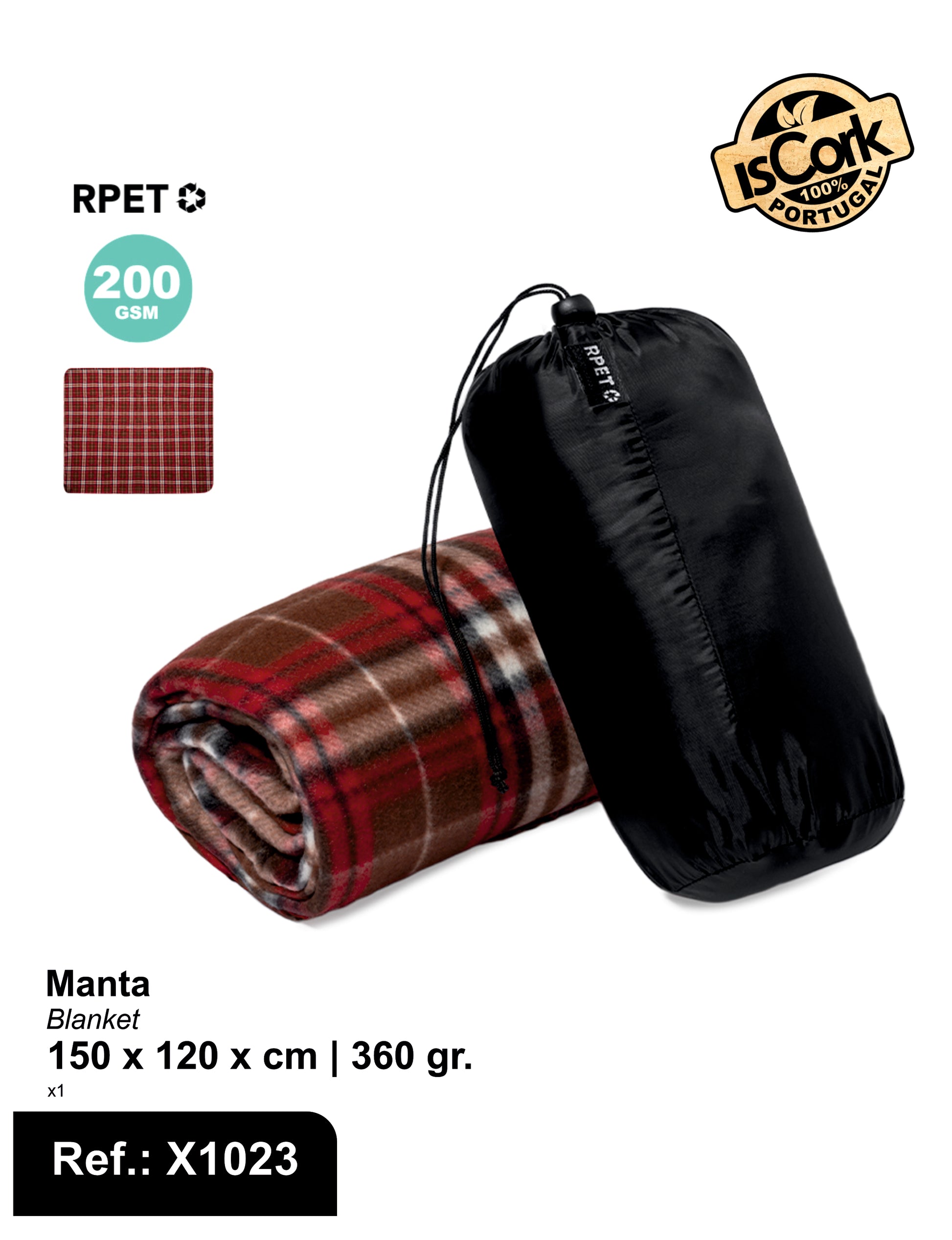 Manta fabricada em quente poliéster RPET de 200g/m2. Medidas 120x150cm, com padrão tartán bicolor de toque macio. Disponível numa variada gama de cores. De fácil dobragem e de tamanho compacto, inclui bolsa de transporte e fecho automático, com o logotipo RPET na etiqueta.