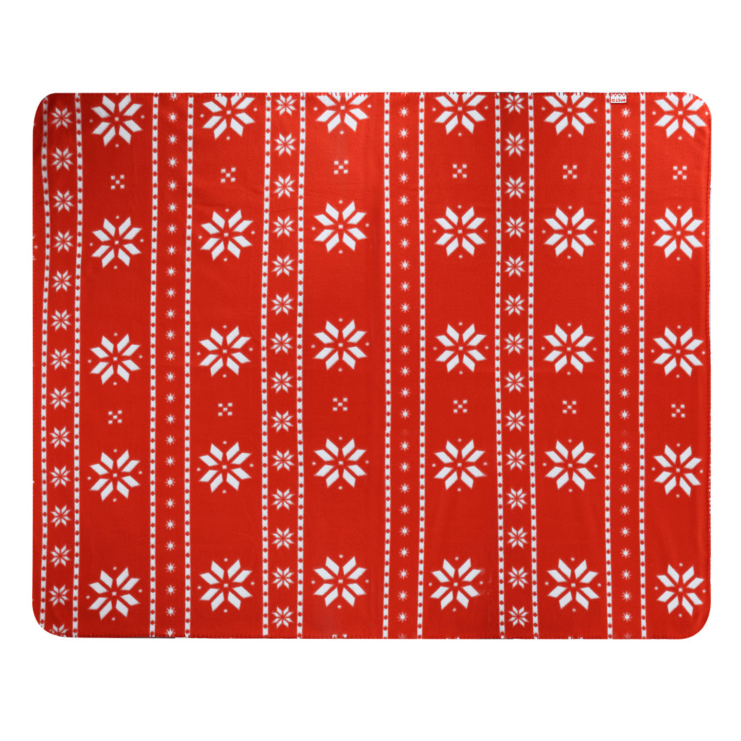 Cobertor de 130x160 cm feito de poliéster RPET macio, com um design de Natal único em vermelho com motivos de Natal brancos. Feito de material de lã macio e quente de 200g/m² com tratamento anti-pilling. Com etiqueta RPET e apresentado numa caixa de cartão individual de cor branca, com fita correspondente.