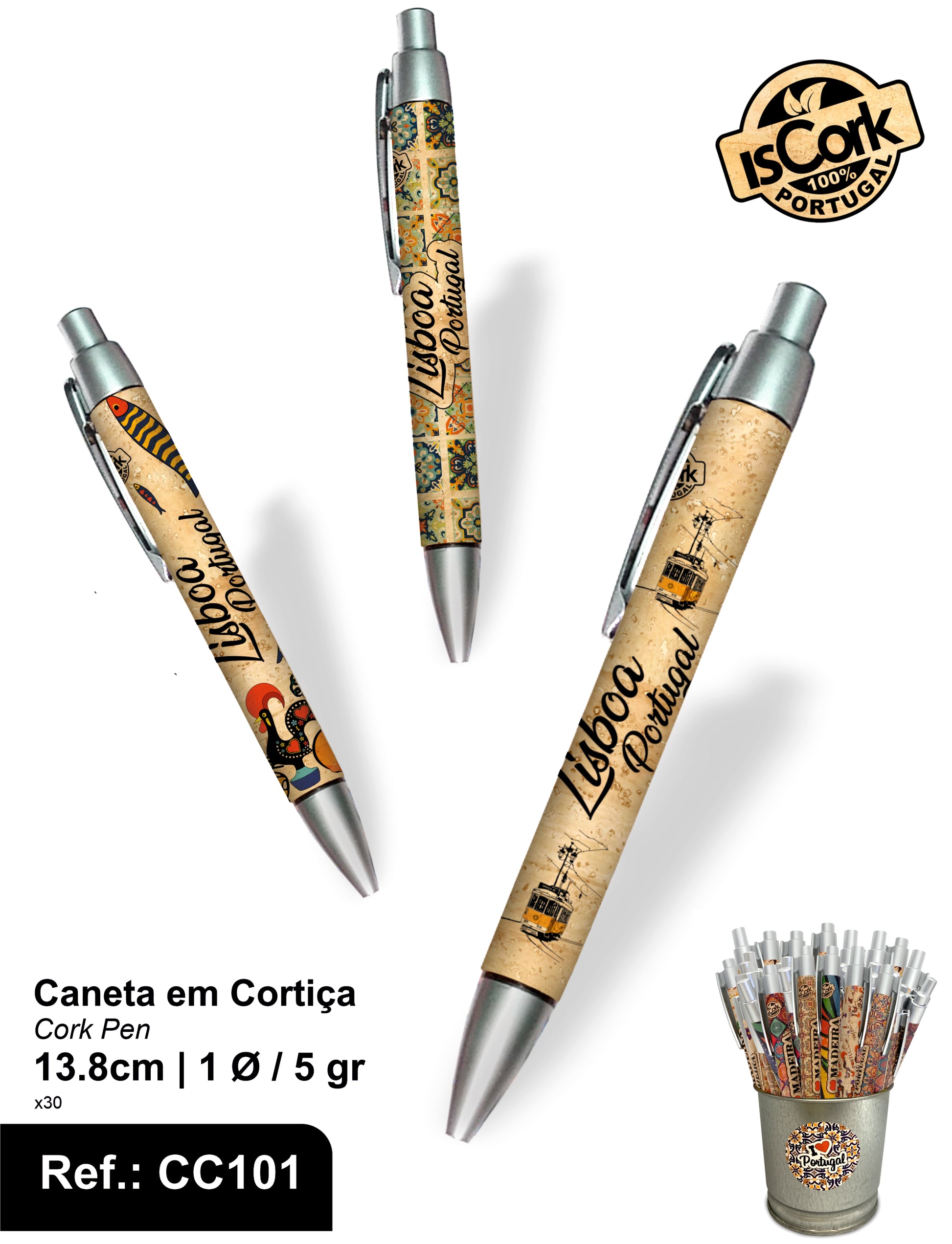 O corpo em bambu é durável e sustentável, tornando esta caneta uma opção ecologicamente correta. O acabamento em cortiça adiciona um toque de textura e calor à caneta, além de ser agradável ao toque.