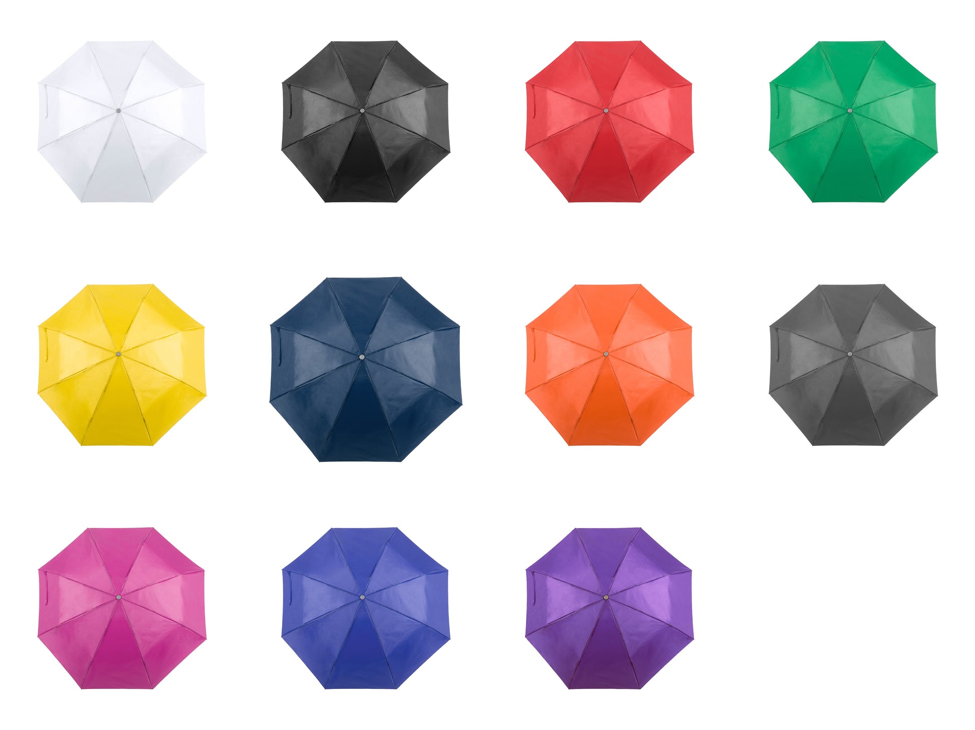 Chapéu de chuva dobrável de 8 painéis de poliéster 190T numa extensa gama de cores e 96cm de diâmetro. De abertura manual, com varas metálicas na cor prateada, fecho de velcro e fita de transporte em pega ergonómica. Apresentado numa bolsa individual a condizer.
