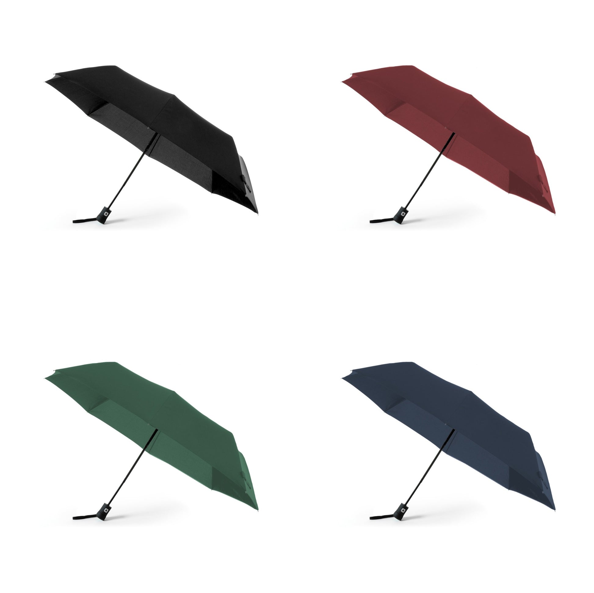 Guarda -chuva dobrável de alta qualidade com 8 painéis em cores sóbrias. 98 cm de diâmetro, com abertura automática e em material de pongee resistente. Com costelas de metal em cor preta, fechamento de velcro e alça ergonômica com alça de transporte. Apresentado em um caso individual de cores correspondentes.