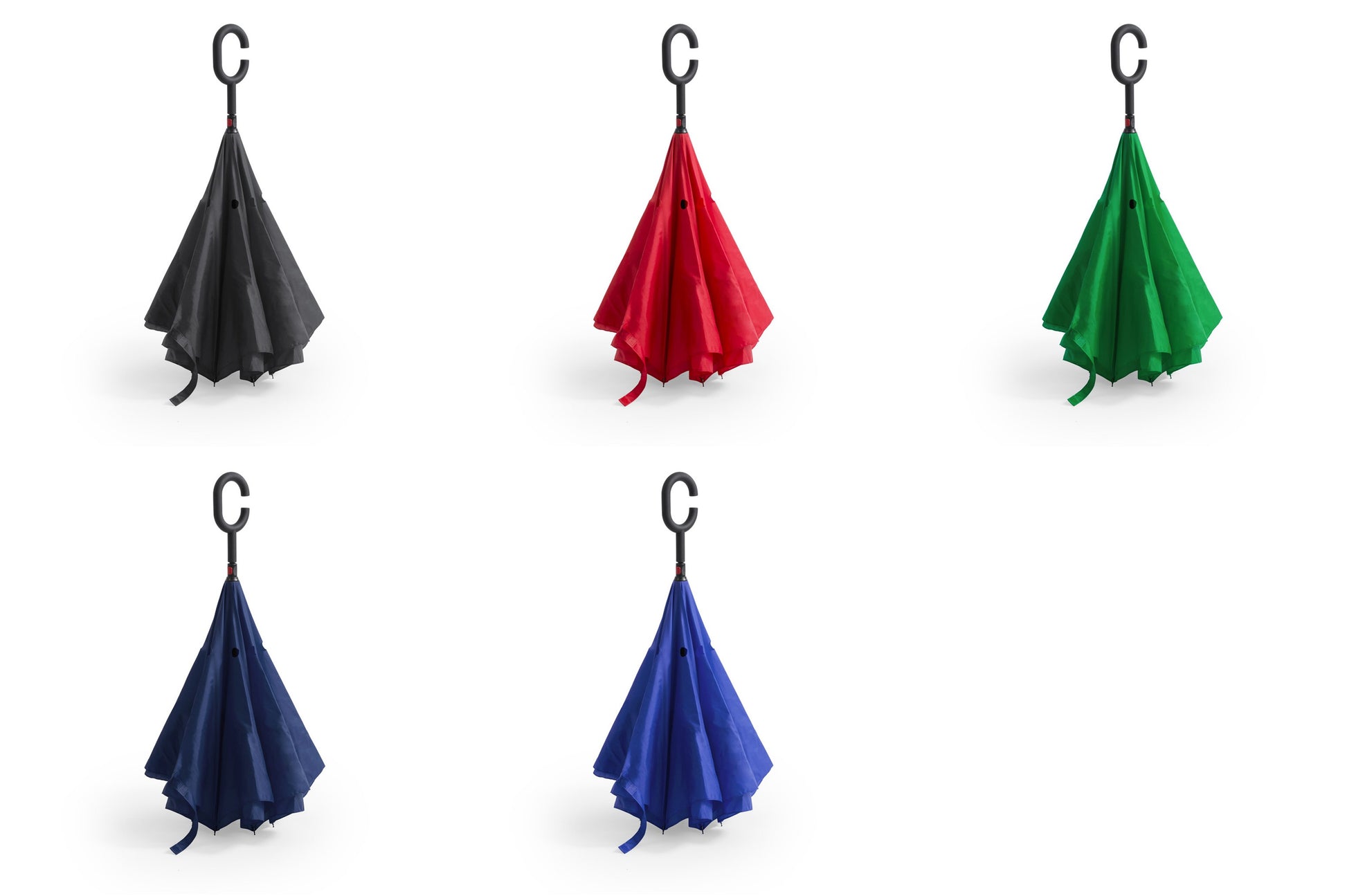 Guarda-chuva reversível de 8 gomos, em material resistente em pongee de cores vivas e com uma pega original mãos-livres. De 108cm de diâmetro, com abertura manual, hastes de fibra e fecho de velcro.