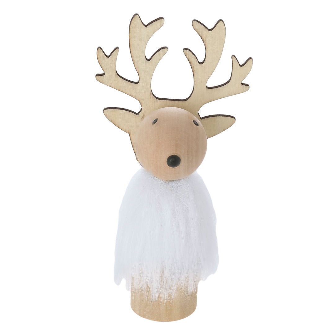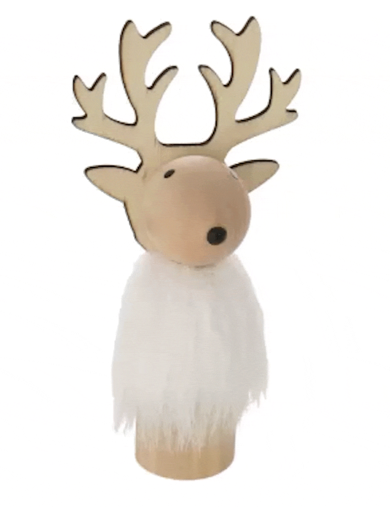 Ornamento de Natal elegante feito de madeira macia. Forma original de rena, com chifres e um belo pelo branco. Base especial para personalização.