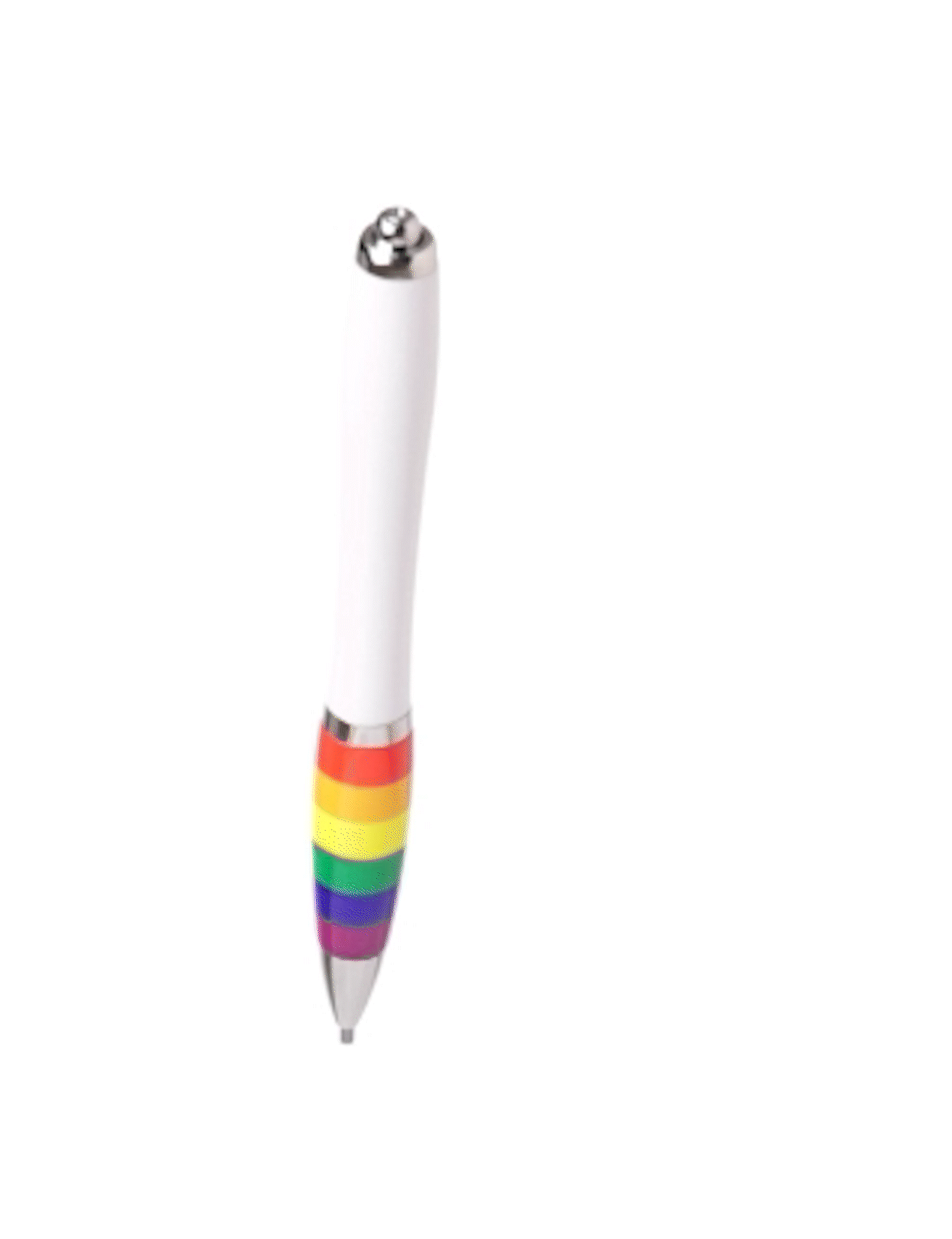 Esferográfica Rainbow com cabo multicolor e corpo com acabamento branco. De mecanismo de pressão, com clip metálico e acessórios cromados. Um orgulho de esferográfica, em tinta azul.