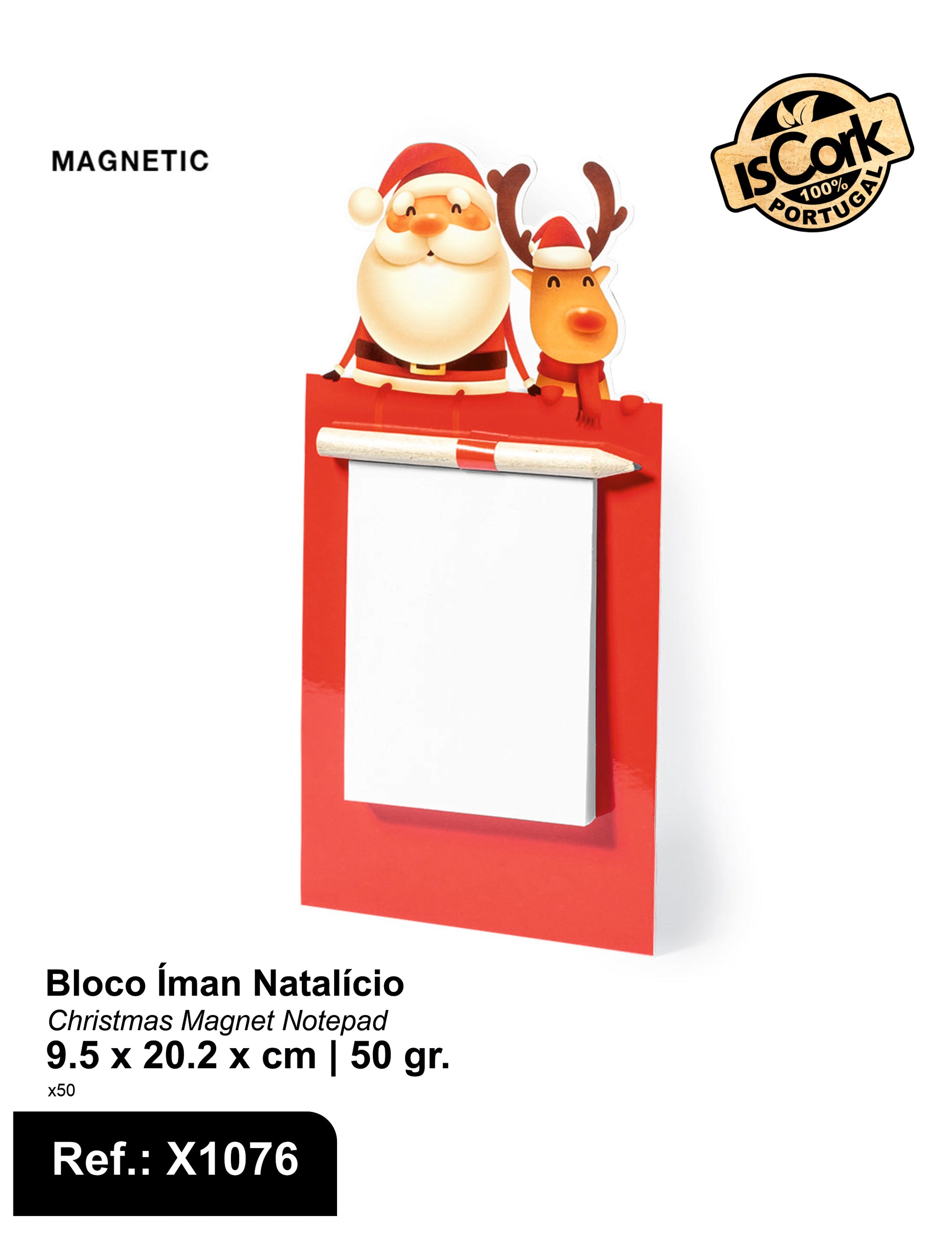 Magnético com bloco de notas em design divertido natalício de Pai Natal e Renas. Inclui 40 folhas lisas e lápis de madeira natural.